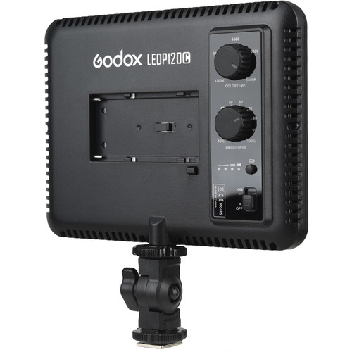 ال ای دی گودکس Godox LEDP120C با قدرت 12 وات ، با امکان تنظیم میزان کلوین از 3300 تا 5600 ، با قابلیت تنظیم میزان روشنایی از 10 تا 100 درصد ، به همراه متصل کننده به هات شو دوربین ، با امکان استفاده از طریق باتری های سری NP-F سونی (که به صورت جداگانه باید تهیه شود)